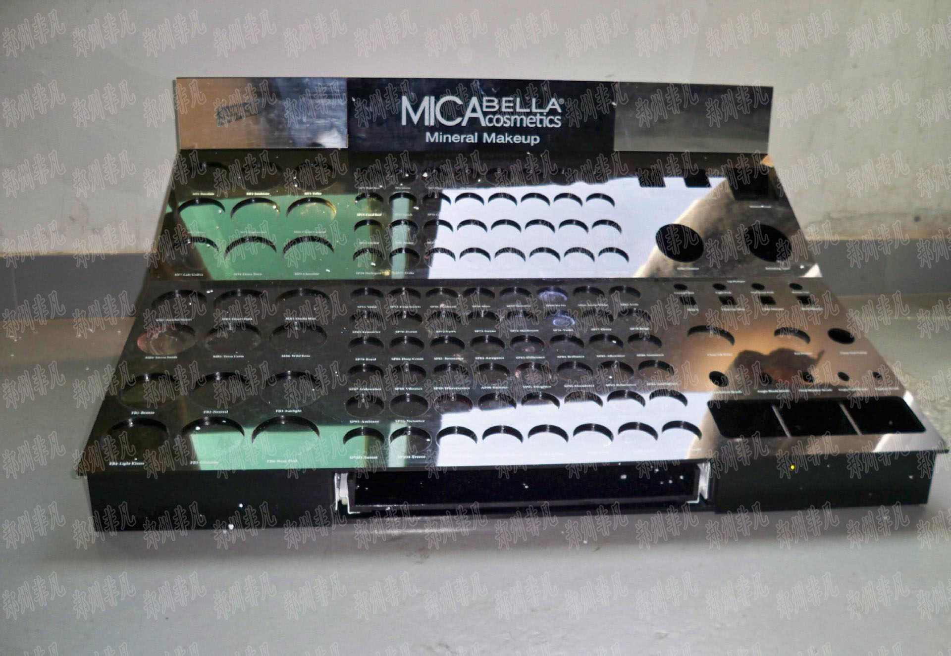 地漏式亞克力化妝品展示架多用于口紅、眉筆、粉餅等彩妝展示,該類亞克力展示架高度大約在70-90cm左右,商品展示位置呈梯田式分布,方便顧客的挑選。亞克力化妝品展示架在設(shè)計時需根據(jù)不同化妝品的外形開放不同的凹槽用于固定及區(qū)分商品。一般該類亞克力展示架均采用黑色亞克力板制造,一來可以突出商品其次還便于印刷商品展示信息。