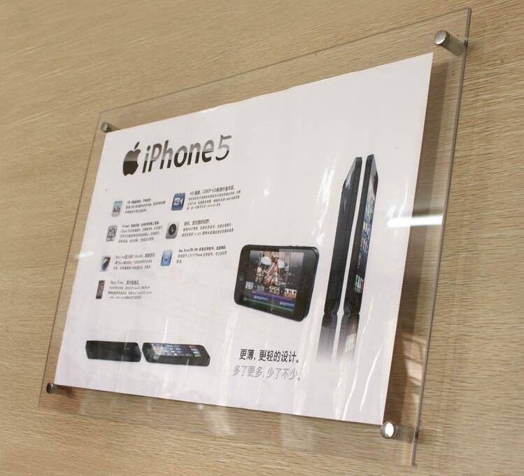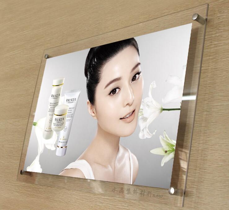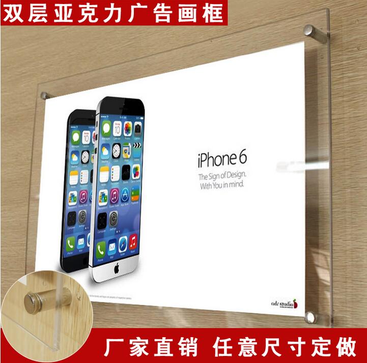 每套亞克力雙層夾板由2塊透明亞克力板組成,中間夾畫面。亞克力雙層夾板四周用廣告釘固定在墻壁或者木板上。