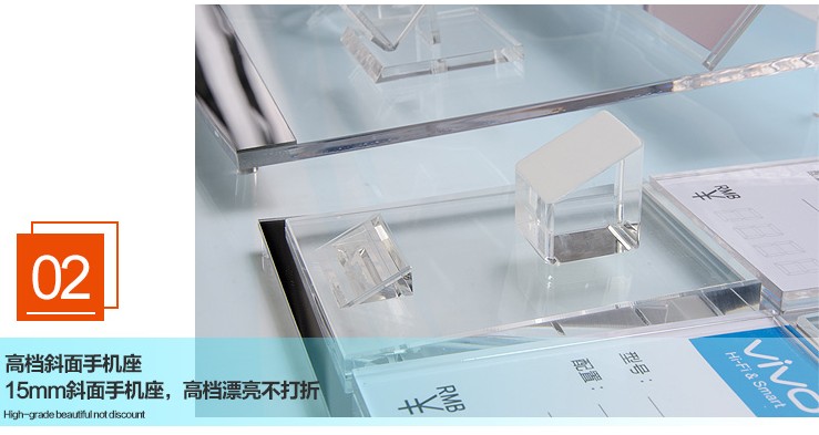 下圖均為亞克力手機(jī)組合展示架實(shí)物拍攝,亞克力手機(jī)組合展示架的底板采用8mm厚亞克力板加工制作,手機(jī)座為15mm厚斜面
