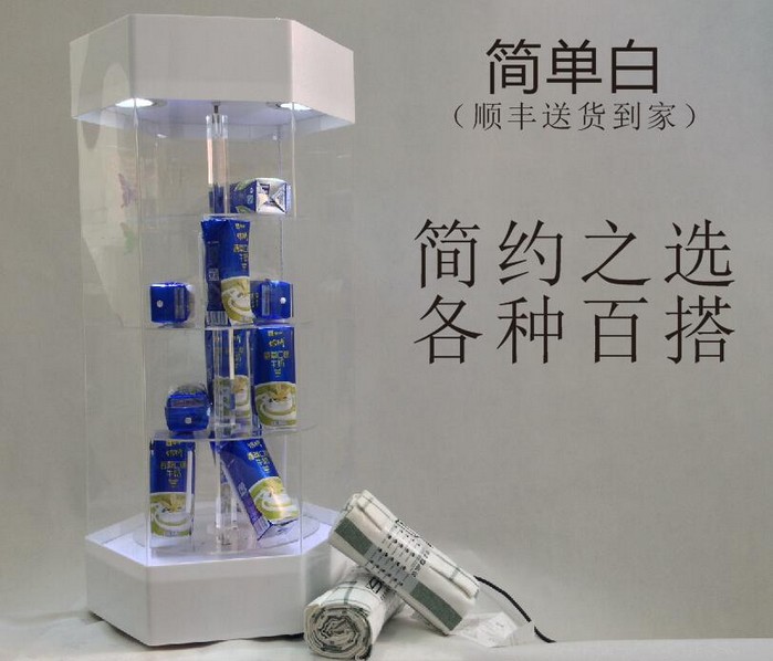 有機(jī)玻璃旋轉(zhuǎn)展示架頂部裝有多盞射燈,展示架裝有優(yōu)質(zhì)電機(jī),旋轉(zhuǎn)的同時(shí)還帶有燈光效果,
