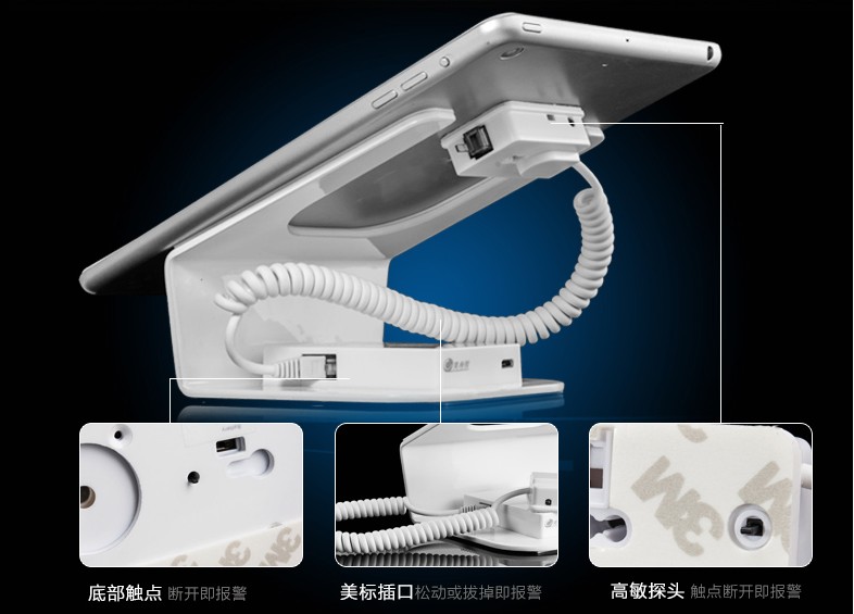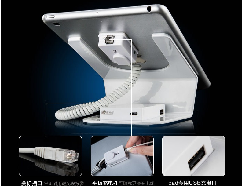 (2)亞克力iPad展架內(nèi)有隱藏式蜂窩報警器,能在喧鬧的賣場發(fā)出高達105分貝的報警聲